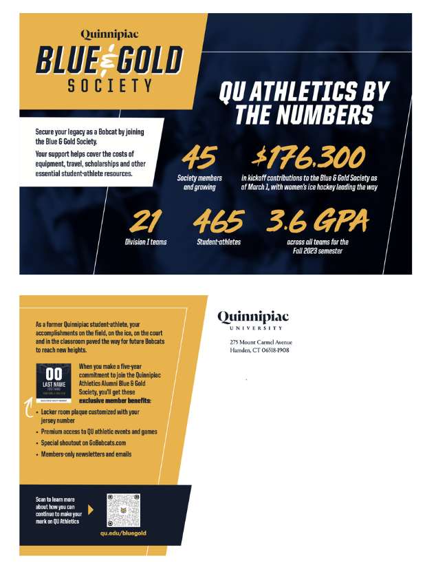 Established in 2023, the Blue & Gold Society is an exclusive philanthropic giving society for Quinnipiac Athletic Alumni, that aims to benefit Quinnipiac student-athletes not only today, but for years to come.