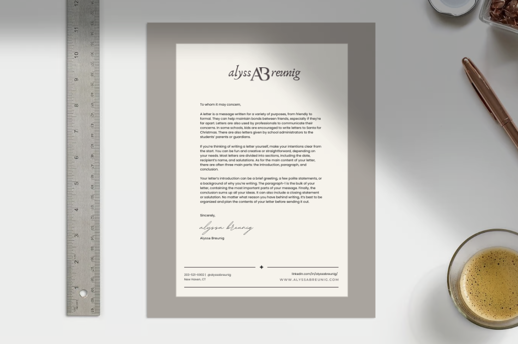 Letterhead is a fundamental component of a brand's marketing materials. My minimalistic design displays my brand's logo, colors, and typography, reinforcing brand recognition.