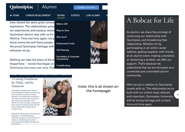 Where they begin to lose their audience is the over-abundance of information...There are five additional tabs on the home page: career development, giving, events, law alumni, and alumni support with at least 7-8 sub-tabs underneath. Under giving there are essentially five tabs informing you on how/where to give, which seems completely unnecessary.