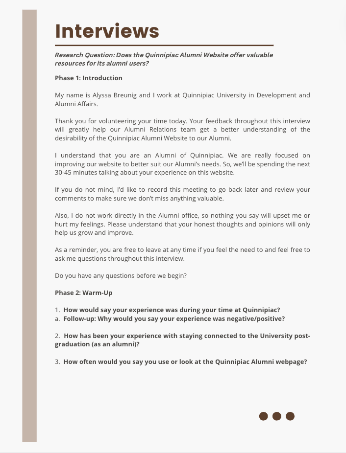In our usability test sessions, three participants were given five tasks to complete on the Quinnipiac Alumni website. These tests were conducted and observed to better understand how real users interact with our website. These sessions were imperative in understanding the website's areas of confusion and providing opportunities to improve the overall user experience.